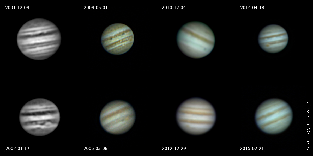 With good image quality, much finer detail can be seen in the bands, such as thicker and thinner regions at different longitudes, bright spots or dark spots. At times the thin temperate bands NTB or STB, at higher latitudes than NEB or SEB, can be seen, or a thin band directly at the equator.