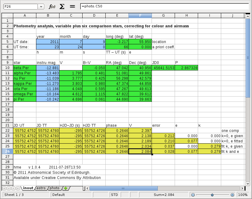 The photometry spread sheet helps you with the analysis of photometric images. The main purpose is to take the instrumental magnitudes of one variable star and six comparison stars and to work out the Johnson V magnitude of the variable.